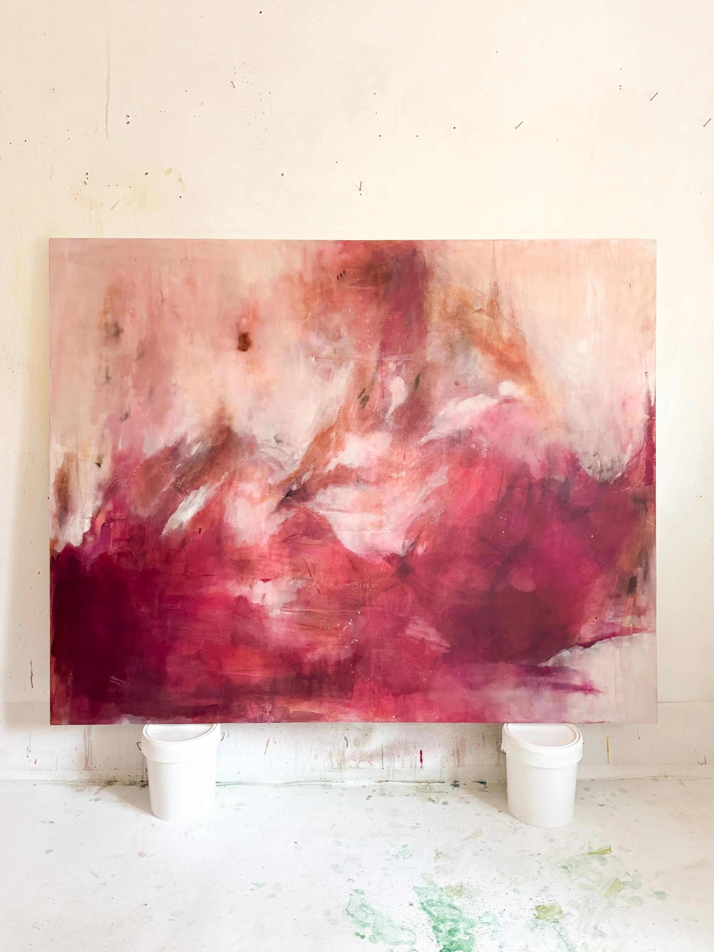 Abstract pink and white painting on a canvas supported by two white buckets, with paint marks on the floor and a white wall background.