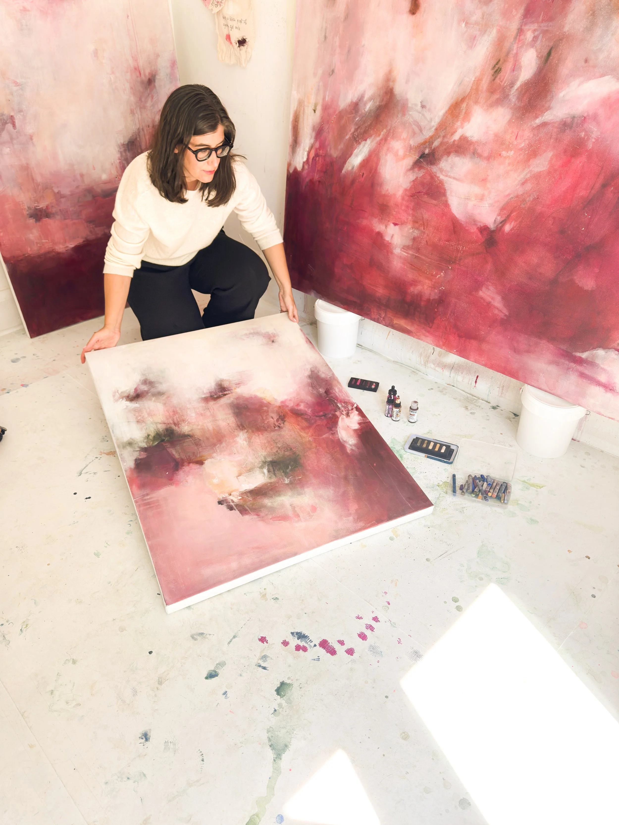 Woman with dark hair and glasses working on large abstract pink and red paintings in a bright art studio with paint supplies on the floor.
