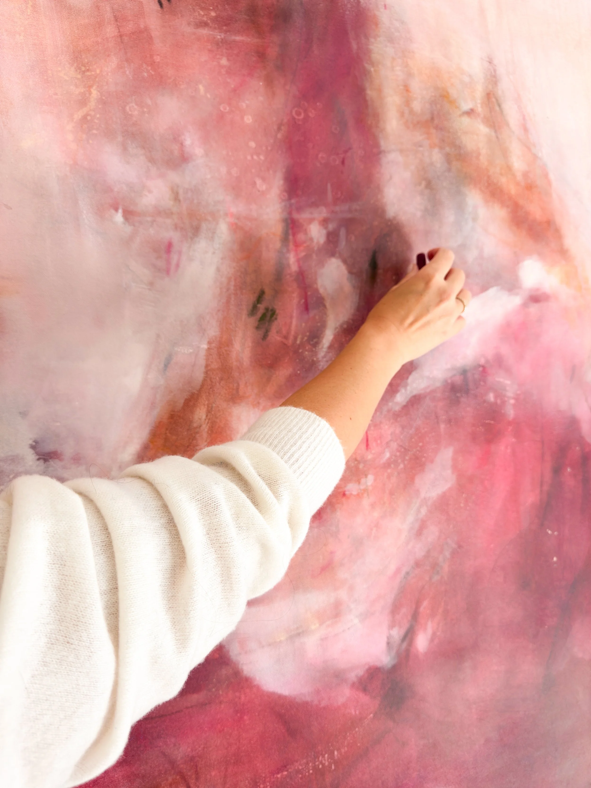 Person with a white sweater is painting on a pink and red abstract canvas.